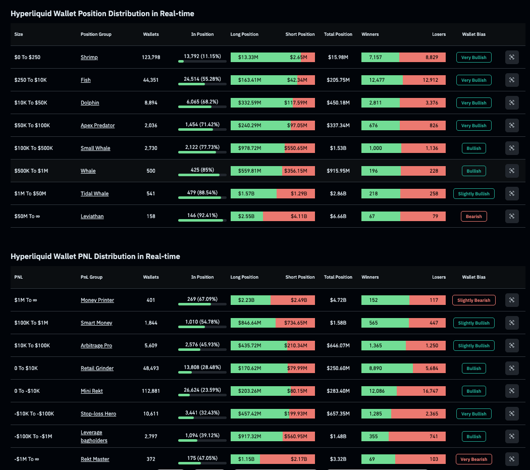 第二个则是这 16 种用户类型当前是多空和输赢的整体比例相关信息,大体上一看相当能够反映每位置的玩家现在对待市场的态度,比如像是笔者这样 0 到 250 美元的 SHrimp 或者 250 美元到 1 万美元的 Fish 开仓的比例都不高,反而是超过 1 万美元的类型玩家几乎都在上仓位操作。