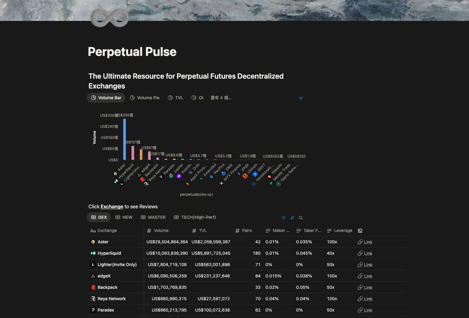 Perpetual Pulse 是 Lighter 的团队成员 hanSolar 做的 PerpDex 数据仪表板,提供类似的整体市场数据监控功能。它对多链路的合约交易量和 TVL 还有 OI 进行追踪,并可实时更新行情变化。