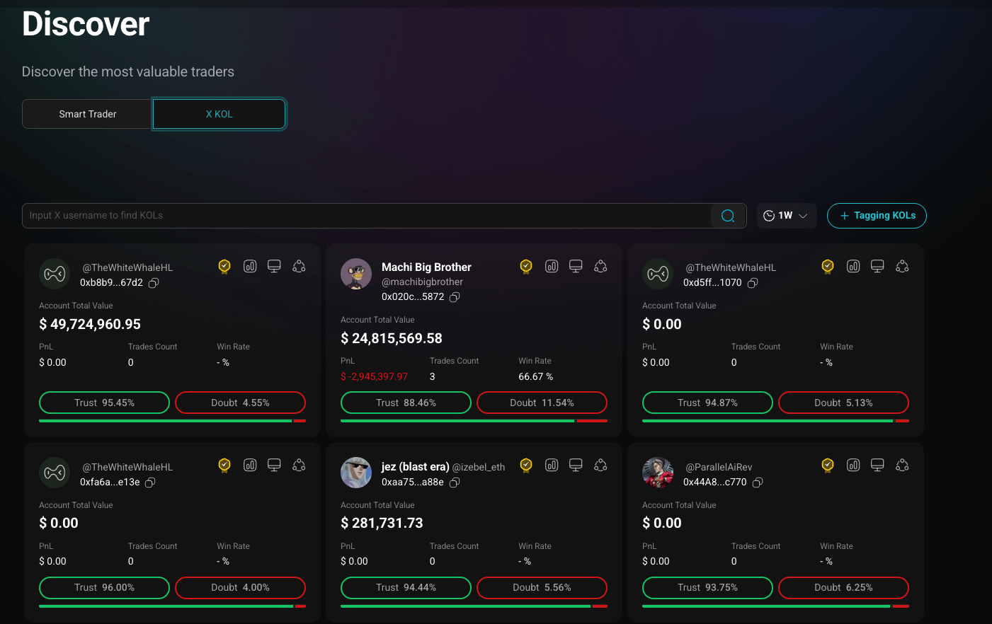 链上钱包分析不管是链上还是中心化交易平台,聪明钱的去向从来都是一个令人关心的问题,他们往往会带来比 KOL 的粉丝更高的交易动能,因为跟踪他们通常是自发的行为,尤其是链上交易地址分析的工具诞生的时候,而无论是 Memecoin 风潮还是预测市场期间,这类辅助项目都是首当其冲出现的,PerpDex 也不例外。