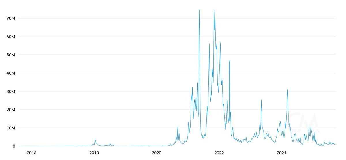 自 2020 年以来,代币化资产的价值和稳定币的交易量已增长 100-1000 倍。然而,Tom Lee 的论点却从根本上误解了以太坊的价值积累机制——他让人误以为网络手续费会同比攀升,但实际上以太坊的手续费收入却仍停留在 2020 年水平。
