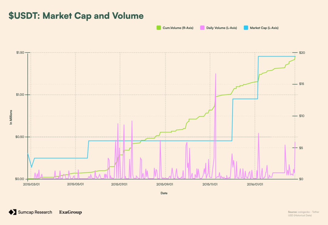 仅仅几个月后,2014 年 11 月,Tether 推出了 USDT——一种法币支持的代币,可按 1:1 比例兑换托管的美元。与 BitUSD 不同,它不需要超额抵押或复杂机制,这种简洁性使其在不到 1 年内实现了 1930 万美元的交易量和 145 万美元的市值。作为对比,当时 ETH 仅价值约 1 美元,而 BTC 在 240 美元左右徘徊。