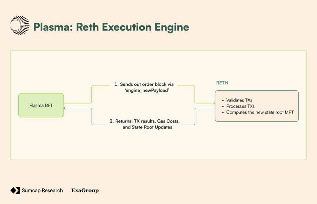 Plasma 的执行层建立在 Reth 之上,这是一个用 Rust 编写的以太坊客户端,完全兼容地管理状态转换、交易处理和 EVM 操作。它通过自「合并」以来以太坊一直使用的相同引擎 API 与共识层连接——允许 PlasmaBFT 处理共识和区块排序,而 Reth 专注于交易执行和状态转换: