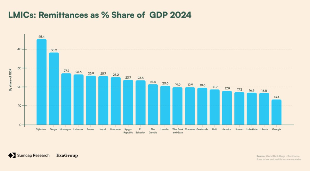 链上支付:跨境支付与工资单2023 年,据报道有 1.84 亿人(占世界人口的 2.3%)居住在其国籍所在国之外。受经济机会驱动,这些移民工人常常需要跨境向家人和社区汇款。这些跨境支付(或「汇款」)在支持中低收入国家的经济方面扮演着关键角色——对其中一些国家而言,甚至占到其国内生产总值的一半。