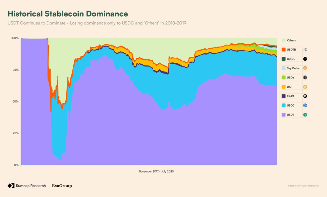 与此同时,法币支持的竞争对手也在并行发展: USDC 于 2018 年推出,将自己定位为受监管、完全由美元支持且具有透明度认证的代币,迅速成为 DeFi 的首选抵押品。
