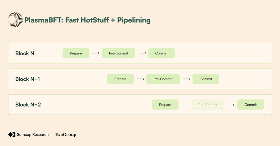 PlasmaBFTPlasma 的共识层通过高性能实现的 Fast-HotStuff 来保护链的安全。传统的 BFT 协议(如 HotStuff)中,最终确定一个区块需要经过 3 个阶段: