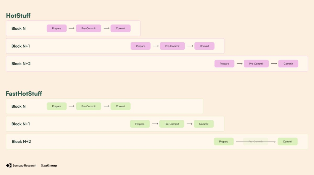 虽然这个过程确实保证了安全性,但它会减慢速度,因为每一步都需要网络通信和协调。Fast-HotStuff 通过所谓的「两链提交规则」减少了这种开销:如果两个连续区块(N 和 N+1)都获得了绝对多数的批准,那么 N 可以立即最终确定,因为在 N+1 上获得绝对多数证明验证者在批准 N+1 时已经锁定在 N 上——因此不需要预提交阶段。