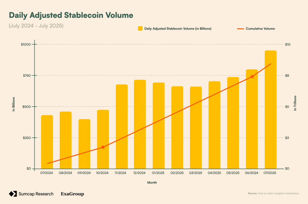 如今,按交易量计算,稳定币是加密货币中使用最广泛的产品。其市值(2716 亿美元)现已超过 DeFi 的总锁仓价值(1661 亿美元)。并且,在 2024 年,当 Visa 处理了 13.2 万亿美元的支付时,稳定币结算了超过 22 万亿美元原始链上交易量——在调整交易所内部转账和 MEV 后,为 5.67 万亿美元。此外,经调整的日交易量在一年内增长了约 120%(从 4323 亿美元增至 9491 亿美元),突显了需求的增长。