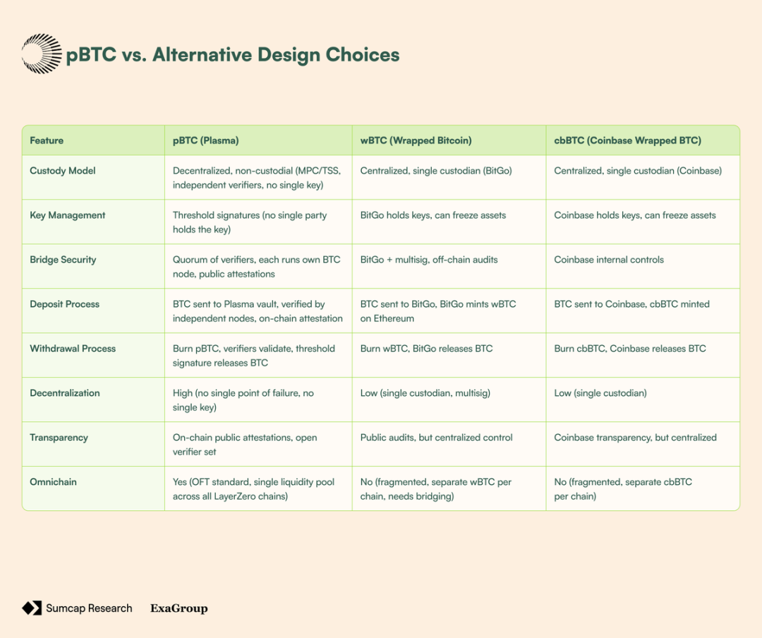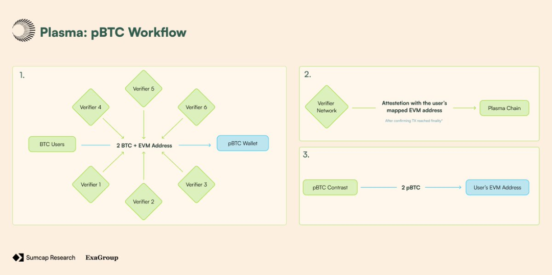 Plasma 的 BTC 桥不由托管驱动,而是由一个验证者网络提供支持,每个验证者都运行自己的比特币节点。没有单一方控制财库,BTC 的转入转出必须由达到法定数量的验证者使用阈值签名集体签署批准。