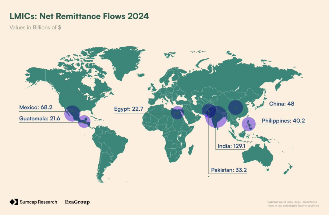 这些巨大的资金流是全球数百万家庭的生命线——但它们伴随着隐形成本。以印度为例。2023 年,据报道印度从美国收到了 160 亿美元的汇款。按平均 200 美元转账成本 4.16%(汇率差价 + 手续费)计算,印度因此有 6.65 亿美元的资金流入了银行 / 外汇机构之手。这种模式在每个主要汇款通道上重复上演。墨西哥每年从美国收到约超过 500 亿美元,按当前转账成本,因手续费损失超过 24 亿美元。与此同时,尼日利亚从美国收到 60 亿美元汇款,损失 1.8 亿美元。