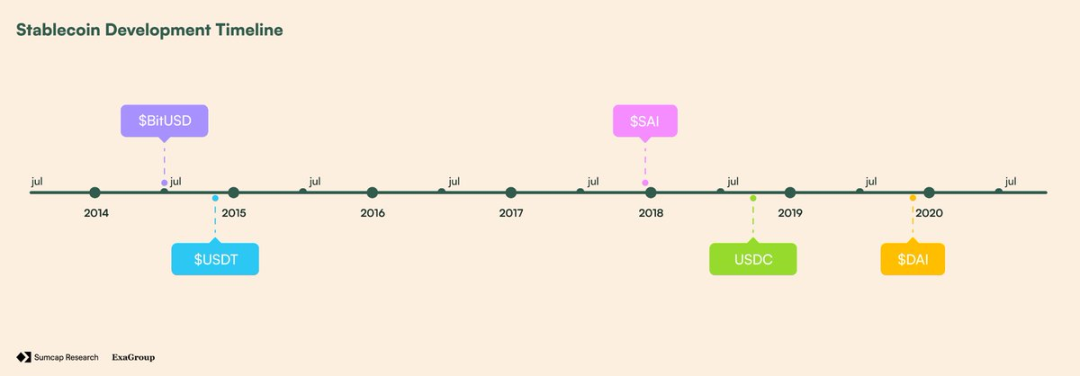 USDT 的成功催生了更多替代方案。MakerDAO(@SkyECOsystem)于 2017 年 12 月推出了 Sai,允许用户将 ETH 锁定到债务仓位中以铸造软挂钩的美元代币,但 ETH 的波动性迫使它升级:2019 年 11 月推出了多抵押 Dai(DAI)。通过分散抵押品和增加由 MKR 治理的风险控制,DAI 成为首个被真正采用的去中心化稳定币。