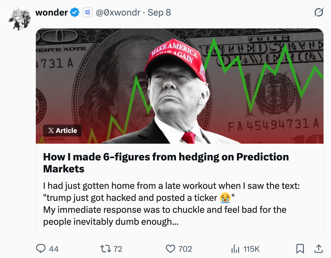 如果我们观察现有的应用案例,@0xwondr 的一篇文章很好地阐释了这一点。他举例说明了自己在今年早些时候 Trump Token 上线时,是如何利用预测市场进行对冲的。他一方面买入了 $TRUMP 代币,同时也在预测市场上买入了「特朗普是否被黑客攻击?」这一事件的「yes」份额。这样一来,如果真的发生黑客攻击,他可以通过所持有的「Yes」份额弥补损失;反之,如果没有攻击事件发生,代币本身会有极大的上涨潜力(而我们也确实看到它最终涨得很高)。