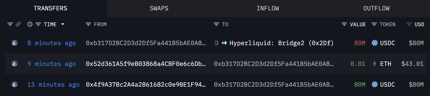其先是向 Hyperliquid 存入 8000 万美元,开设了 3477 枚 BTC 的 6 倍空单;此外,还向币安存入了 5000 万美元的 USDC。地址:0xb317D2BC2D3d2Df5Fa441B5bAE0AB9d8b07283Ae;