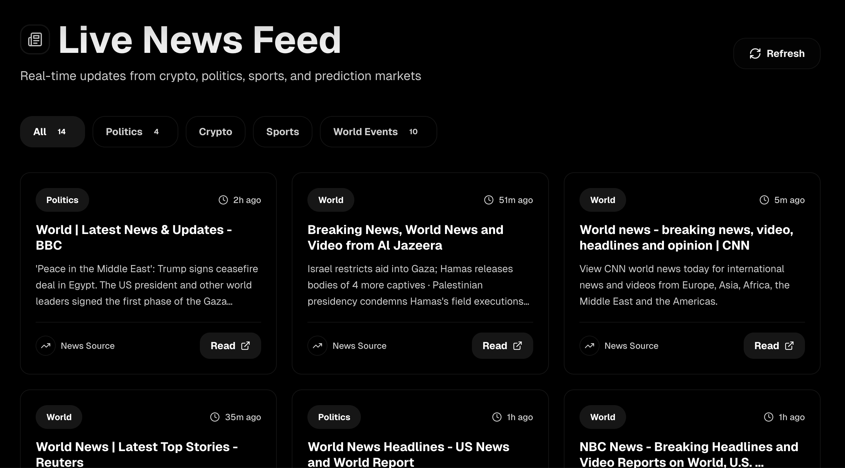 发展至今,Polyfactual 官方网站已经集成了 AI 新闻流,追踪加密、政治、体育等领域动态,并能筛选出与 Polymarket 市场相关的重点消息。用户既可以浏览网站上的 Live Feed 获取要闻摘要,也可以使用前述浏览器插件在 Polymarket 网页侧栏查看 AI 解读。