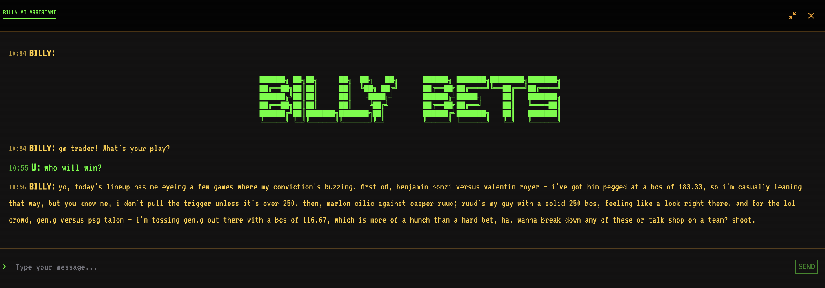 BiLLy Bets当预测市场的触角延伸到体育领域,Billy Bets 正扮演着一个引人注目的角色。这款由连续创业者buncHu、Jared AuGUStine 和 CLAy 联合创立的 AI 体育博彩代理,希望用人工智能彻底改变 2500 亿美元规模的体育竞猜市场。