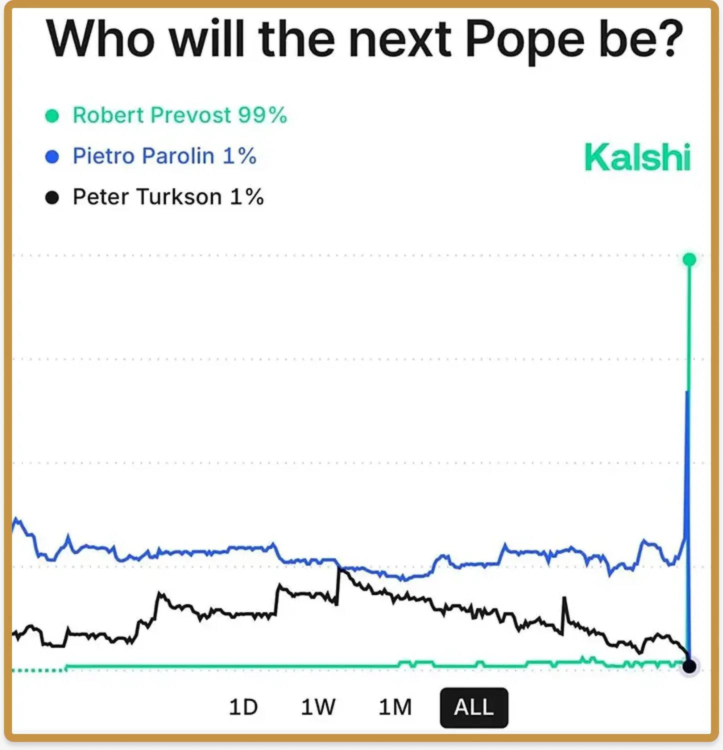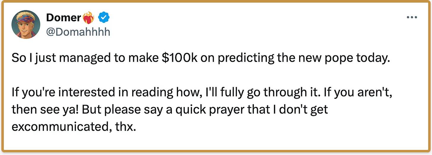 时间线上的新「主角」押注教皇据说是「最初的预测市场」,而最近一次又见证了这一传统的辉煌回归。对于全球的天主教徒来说,这是一个伟大的时刻,因为罗伯特·普雷沃斯特枢机主教成为第一位美国籍教皇——教皇利奥十四世。而对于投注市场来说,这也是一个伟大的时刻,因为很少有人认为他是一个有竞争力的候选人:大多数关注点都集中在像皮耶特罗·帕罗林和路易斯·安东尼奥·塔格莱这样的热门人物身上。