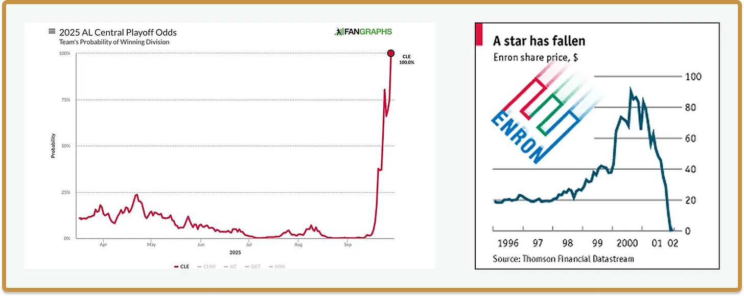 尽管这些图表非常吸引人,但它们有一个主要局限性:它们几乎只存在于政治、体育或金融市场领域。原因显而易见:这些图表的运作需要广泛接受的预测赔率,并且这些赔率必须合法使用。金融市场一直拥有这些赔率;选举则有民调数据可以利用,因此可以像奈特·西尔弗(Nate SILVER)那样构建这些概率路径。而体育赛季(甚至单场比赛)则有明确的结构和足够的历史数据,可以自信地预测球队赛季中的季后赛晋级概率。除此之外,「故事形状」的形式无法更深入地扩展到流行文化中。