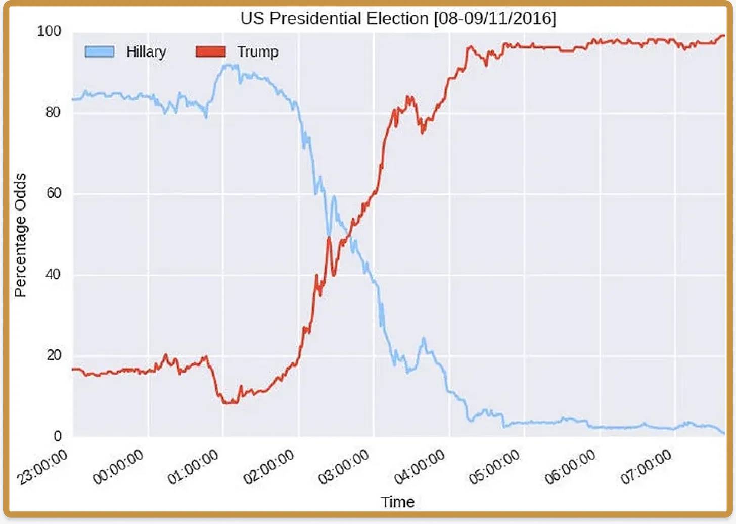 在 2010 年代中期,一种新的视觉内容形式开始出现在选举、体育比赛和季后赛竞争中:即「概率随时间变化」的图表。这些图表之所以吸引人,是因为它们讲述了一个引人入胜的故事:最初预计会发生什么,然后实际发生了什么。