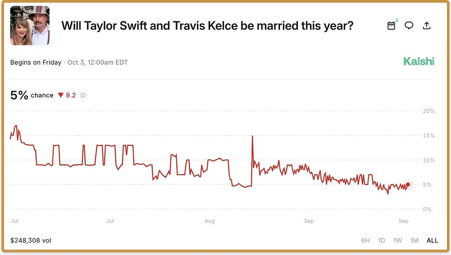 然而,自那篇文章发表的一年半以来,情况发生了有趣的变化:预测市场迅速进入主流流行文化。正如每周体育比赛的巨大赌注量所预测的那样,最大的市场是体育领域。但它们已经成功进入主流文化——甚至成为《南方公园》的一集主题——同时还涵盖了从纽约市市长选举结果到美联储政策利率路径,再到泰勒·斯威夫特结婚时间段的各种市场。