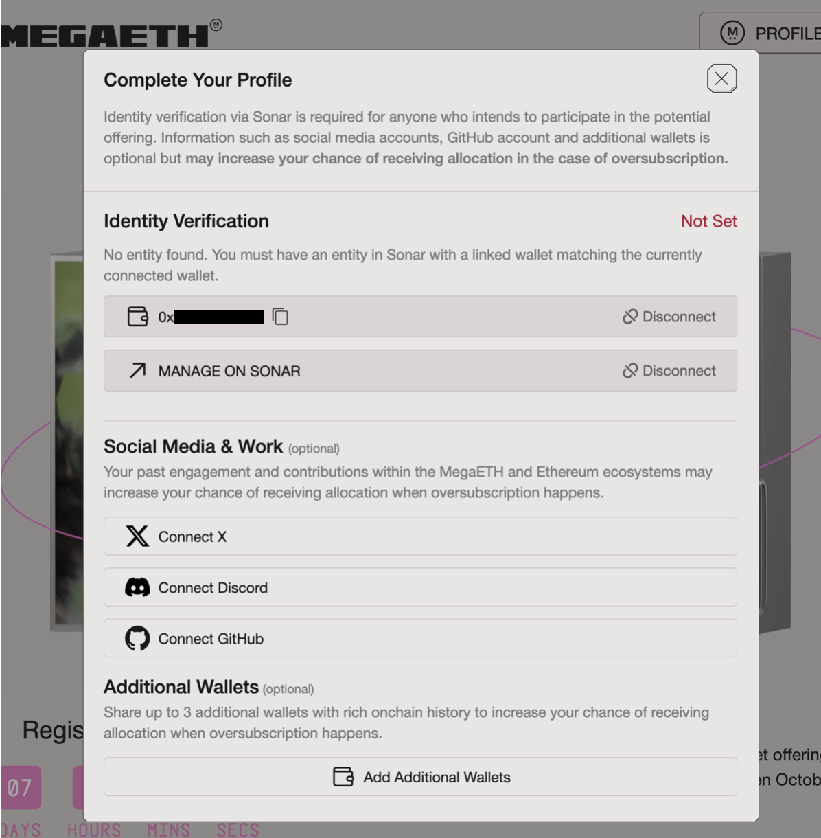 一、MegaETH 如何 KYCSonar 上目前最火的 ICO 是 MegaETH,10 月 15 日至 10 月 27 日期间处于注册时间,注册截止时间还有 6 天。完成 KYC 身份验证步骤比较多,但在资料完善且顺利的情况下几乎是秒通过的,如果需要等待的话则是在进行人工审核,需要等待至少 1-3 天,因此尽早完成 KYC。