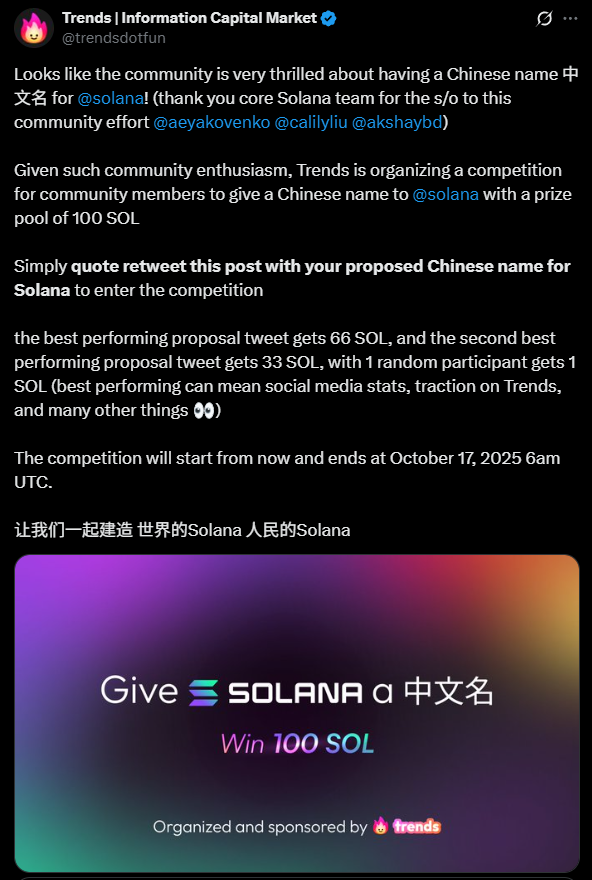 这是个挺有意思的事,几天前,社交协议平台 TRends 启动「为 SoLAna 征集中文名」活动,同时为活动设置了 100 SOL 奖池。用户引用转发官方推文并写上为 Solana 提议的中文名即可参加。奖励规则为表现最佳的提案推文获得 66 SOL,第二名获得 33 SOL,另随机抽出 1 名参与者获得 1 SOL。毕竟现在中文 meme 情绪火爆,100SOL 的奖励也相当吸睛。
