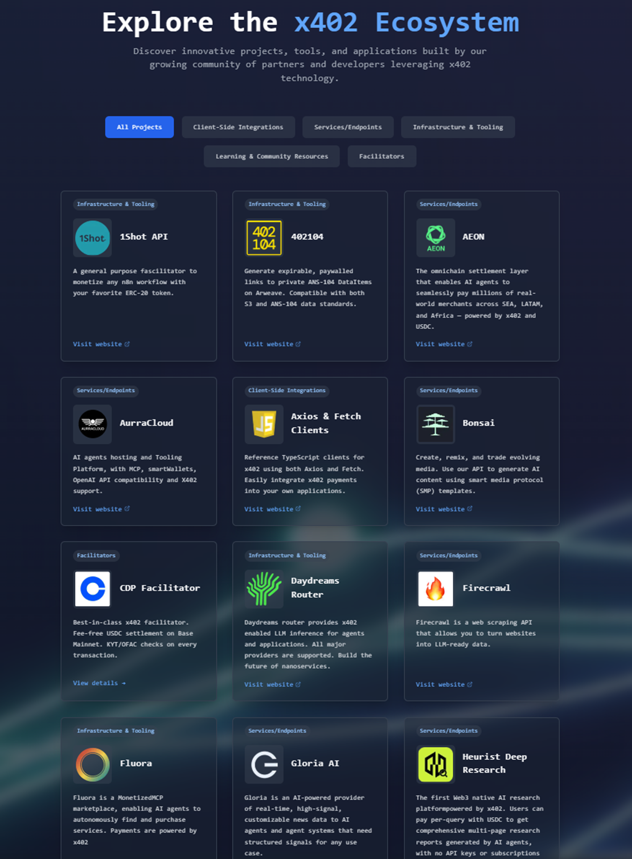 在 x402 协议的官网上的 ECOsystem 页面有着当前的项目汇总。如果一个一个项目点进去查看的话,会感觉到这个协议仍然处在一个相当早期的发展阶段。点进去直接是技术文档或跳转到 Github 的项目也不少。