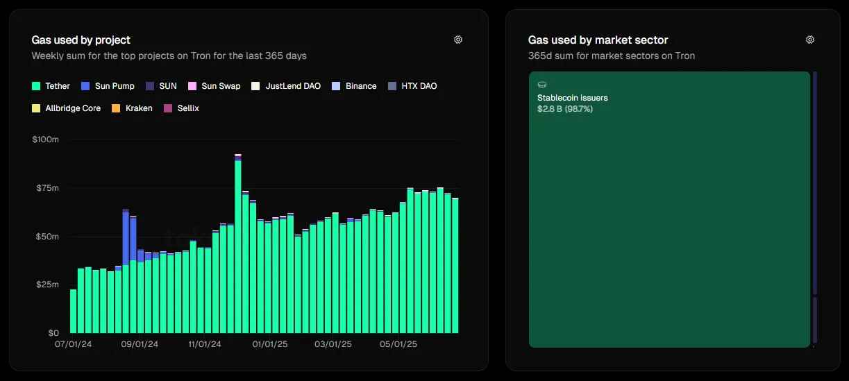 稳定币交易产生的 gas 费用占 Tron 网络总 gas 费的 98.7%来源:token terminal我们不是在被动应对市场竞争,而是主动提出解决方案。比如,我们选择 USDT 作为链上的原生 Gas 代币,这是一个很大的差异化优势,也能为用户带来实实在在的价值。