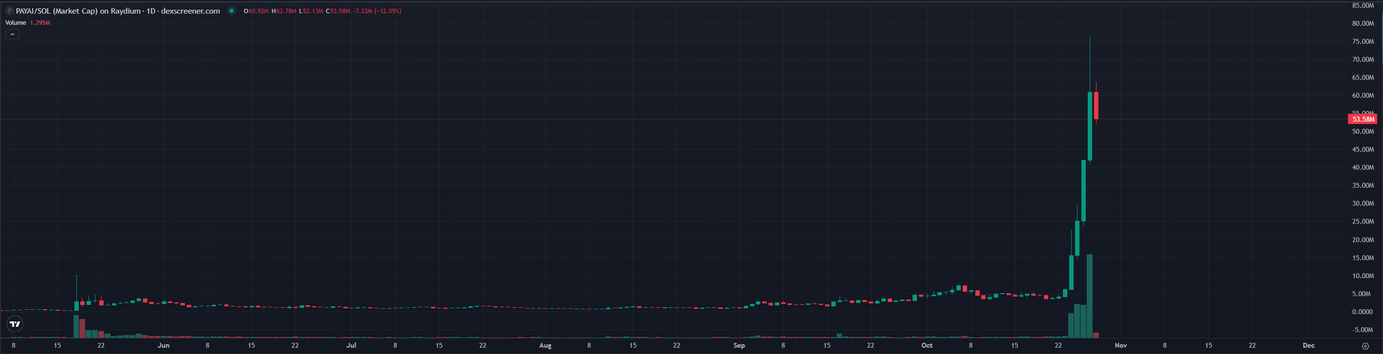 $PAYAI 后发制人,成为了 x402 协议的新龙头。昨天,$PAYAI 市值一度突破 7600 万美元,自 10 月 24 日以来最高上涨了约 12 倍。目前,该币出现回落,市值约为 5300 万美元。