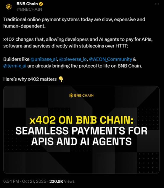 BNB 链官推同样在昨天发推宣传了 BNB 链上的 4 个 x402 协议相关项目,分别是 Unibase、pieVerse、Aeon.xyz 以及 TermiX AI。