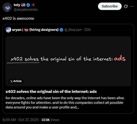 昨天,SOLAna 创始人 toly 发表推文表示,「x402 很酷」。