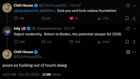10 月 27 日,Chillhouse 日常抽风,「我操你的 Toly,我操你的 Mert(Helius CEO),我操你的 Solana 基金会」。