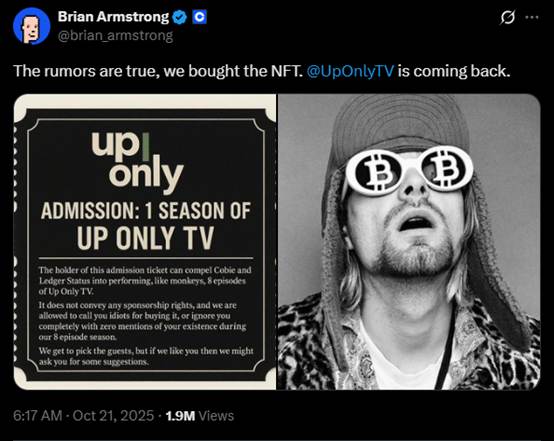 10 月 21 日,Coinbase 花费 2500 万美元从 COBIe 手中购入 UpOnly NFT。随后 Coinbase CEO Brian ArmStrong 发文证实该消息的真实性。Brian 表示,「持有此入场券(NFT)的人,可以强迫 Cobie 和 LEdger Status 像猴子一样表演,录制 8 集《Up Only TV》节目此门票不赋予任何赞助权利,而且我们有权称你为「买这玩意儿的傻瓜」,或完全无视你的存在——在整个 8 集节目中不提你一字。嘉宾由我们自行决定,但如果我们觉得你挺有意思,或许会听听你的建议。」