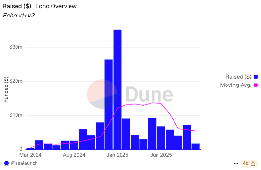 Echo 是一个链上资本继承平台,由知名加密交易员 COBie 创办,旗下有 Sonar 公募工具。Echo 已帮 300 余个项目募资超 2 亿美元,比如 Plasma 的 XPL 代币销售。