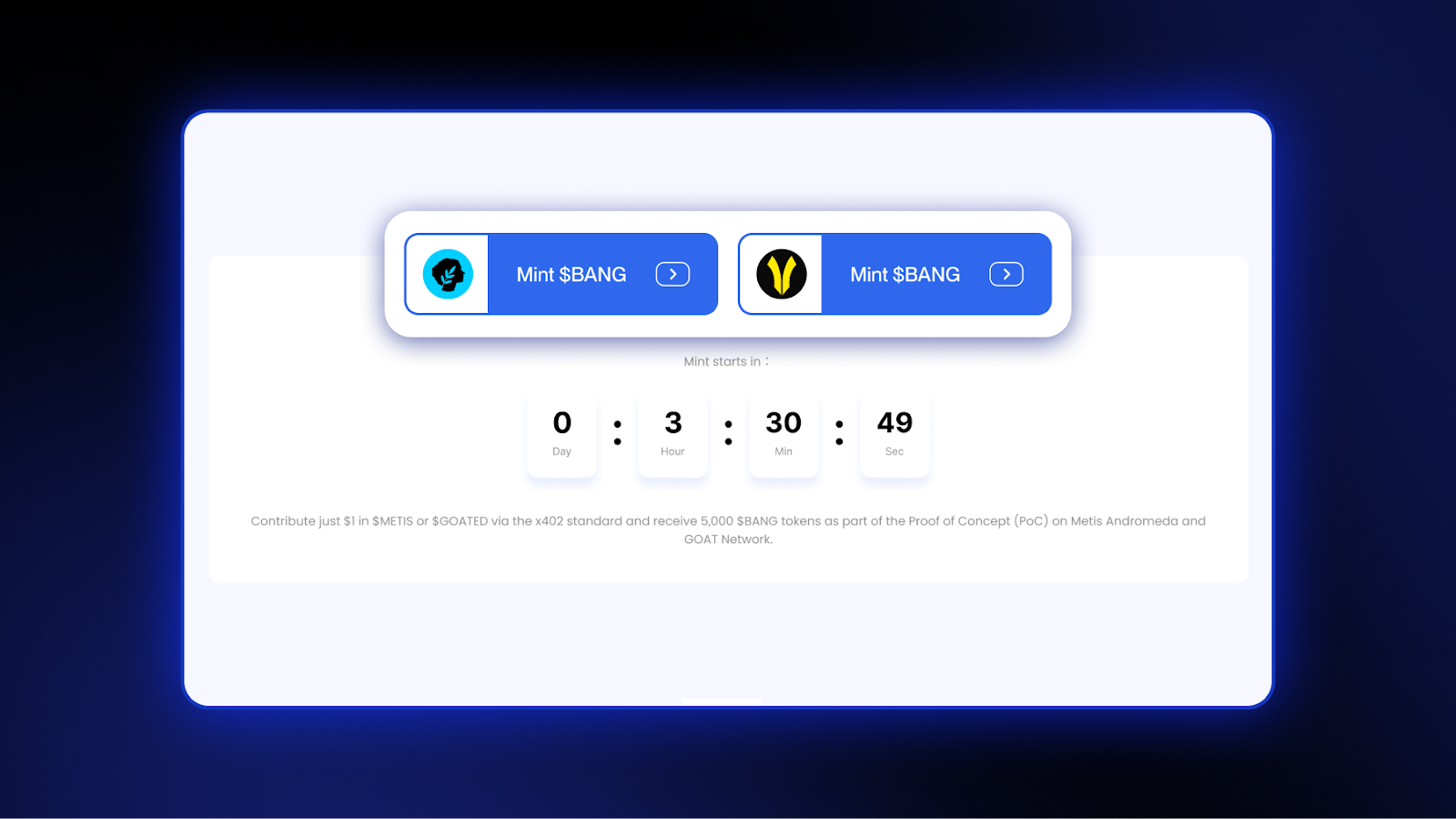 2. 只需通过 x402 标准在$xMETIS 或$xGOATED 中贡献 1 美元,即可获得 5,000 枚$BANG 代币,作为 METIS Andromeda 和 GOATNetwork PoC 的一部分。