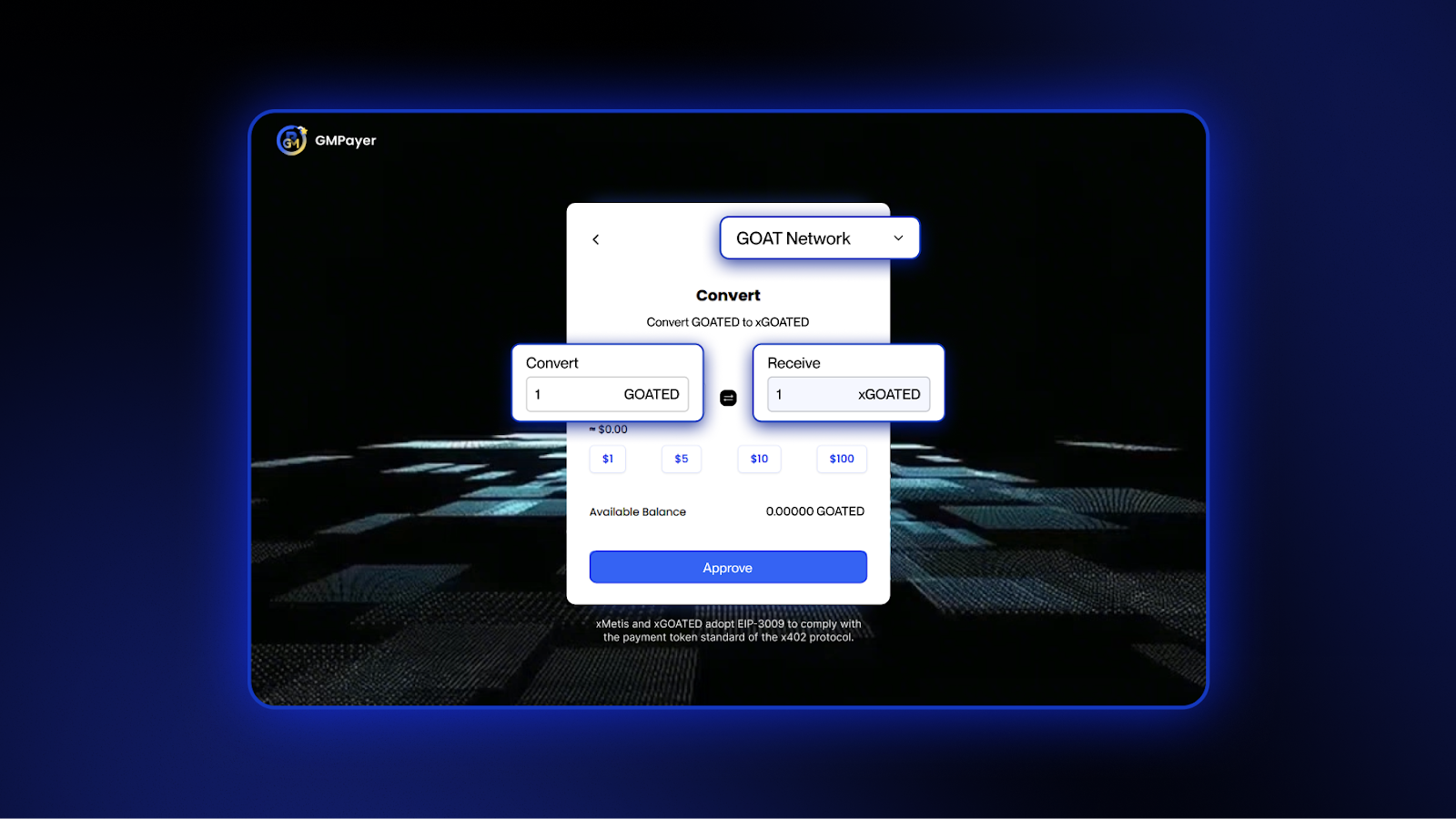 GMPayer 同时支持 Metis Andromeda 和 GOAT Network,并允许您以 1:1 的比例在 $METIS/$xMETIS 和 $GOATED/$xGOATED 之间转换代币。