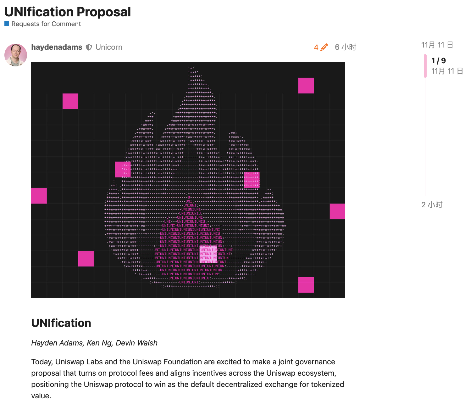 上涨的原因,是 Uniswap 亮出了最后的底牌。UniSwap 创始人 Hayden 发布了一个新提案,核心内容围绕着那个老生常谈的「费用开关」话题。实际上,这个提案在过去两年里已经被提出过 7 次,对 Uniswap 社区来说早已不是新鲜事。