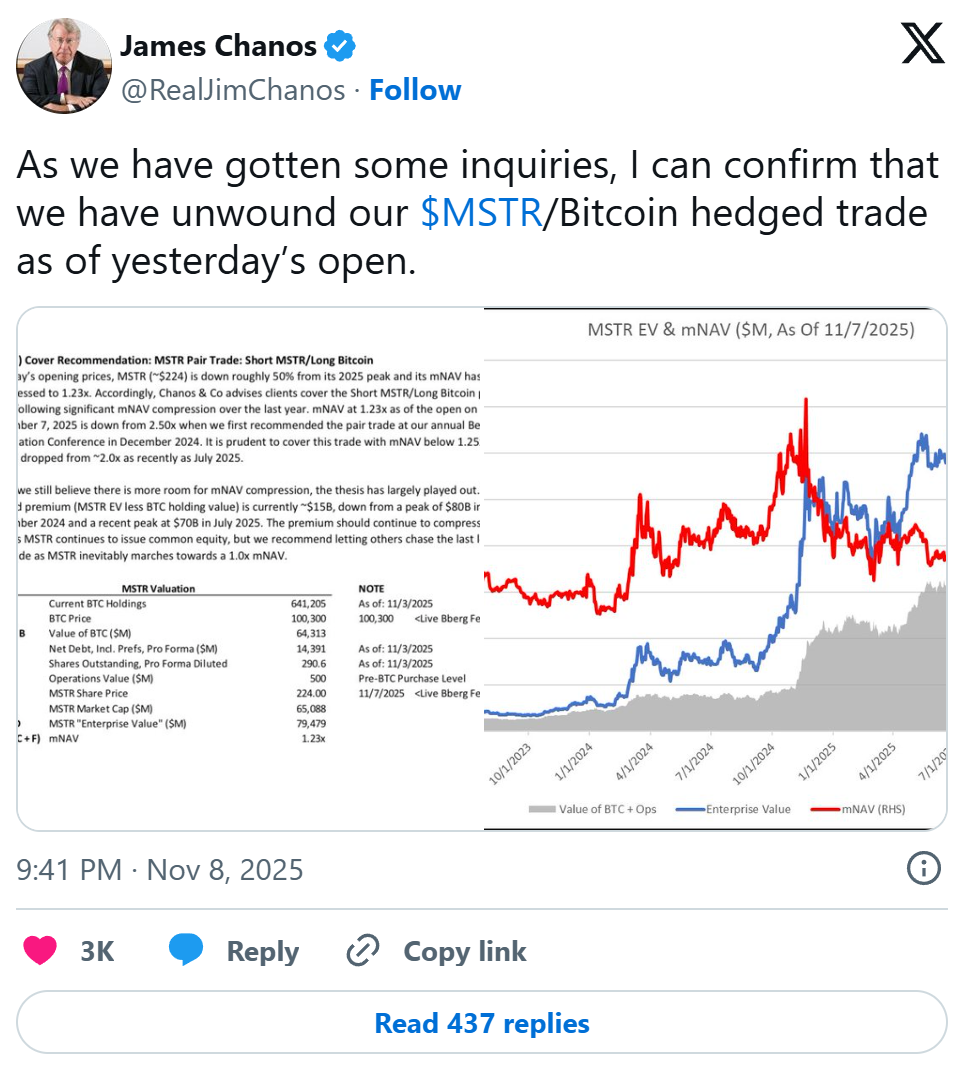 他在 2024 年 11 月建立这笔双腿交易,以表达对 MSTR 表现不及比特币的怀疑;截至上周五早晨,Chanos 及其公司 Chanos & Co. 已全数平仓,账面收益约为 100%。
