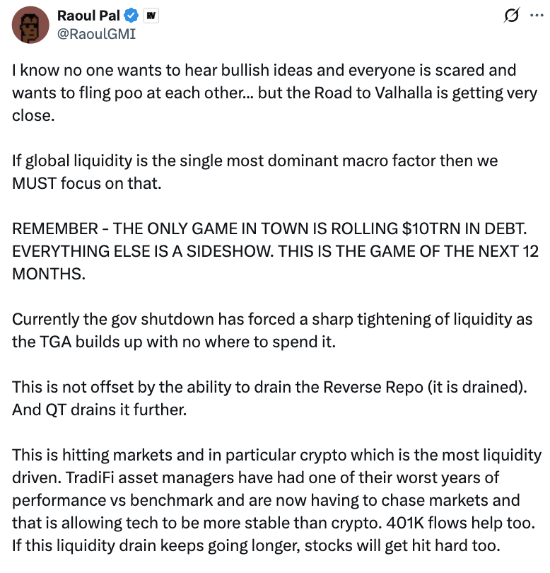 Pal 的逻辑是这样的:美国政府停摆确实导致了流动性紧张。税收仍在流入,但支出却为零。财政部总账户(TGA)余额正接近 1 万亿美元,这是流动性紧缩和比特币表现不如国债的主要原因。