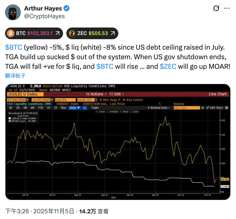 BitMEX 联合创始人 ARTHur Hayes 也呼应了类似的情绪。他将比特币的下跌与自 7 月以来美元流动性下降 8% 联系起来,认为一旦财政部余额在停摆后下降,美元流动性将反弹,推动 btc 走高。
