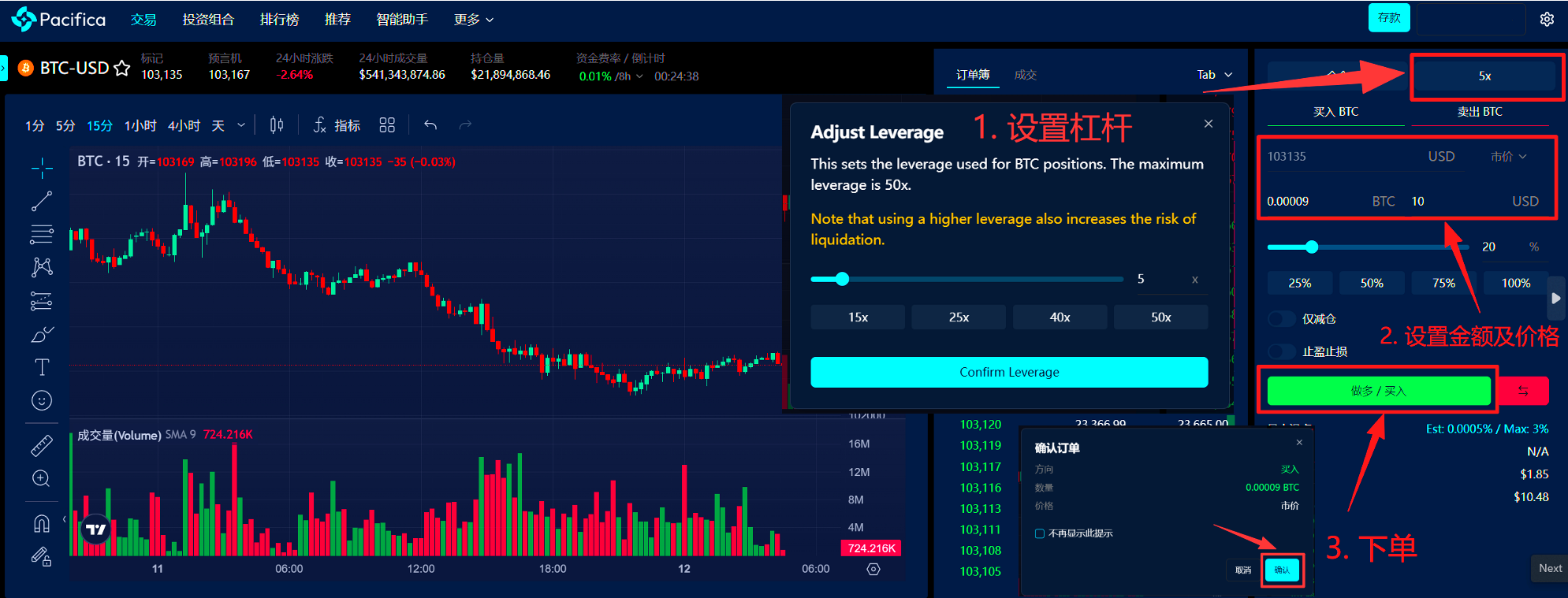根据图中实例:- 设置好杠杆倍数(新手建议小倍操数作,切勿高杠杆)- 开单方向:做多/做空- 开仓金额/市价开单- 开单代币数量- 点击「确认」就可以完成下单了