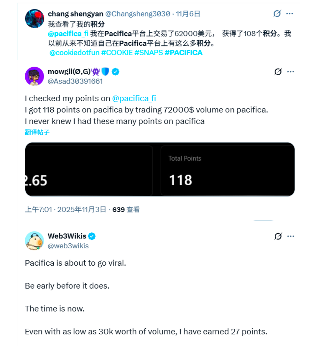 Pacifica 的积分计划于 2025 年 9 月 4 日启动,每周固定在周四 00:00 UTC 进行快照,24 小时内完成发放,将分配给符合条件的活跃用户,具体发放公式暂未公开,多以全平台用户交易量计算,当前每周会发放 10,000,000 积分给交易用户们(此前为 500,000 积分,已于 10 月 30 日上调至 20 倍),根据当周用户总数和交易量进行分配,因此积分的获得是动态的。