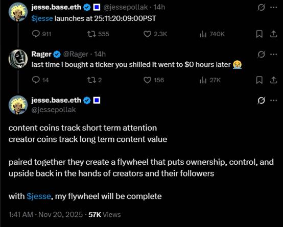 Jesse 为什么要推出他的个人代币?他个人在 X 上的说法是,「内容币追踪短期关注度,创作者币追踪长期内容价值。两者结合,形成一个飞轮效应,将所有权、控制权和收益权重新交还给创作者及其粉丝。有了 $jesse,我的飞轮效应就将完成。」
