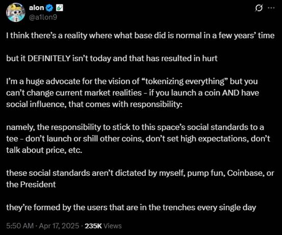 值得一提的有趣插曲是,当时 pump.fun 的创始人 alon 跳出来指称所谓万物皆可内容代币化是对市场的伤害,尤其对有影响力的人来说,发行代币意味着需要承担相应的责任,这是链上不成文但具有默契的规则。