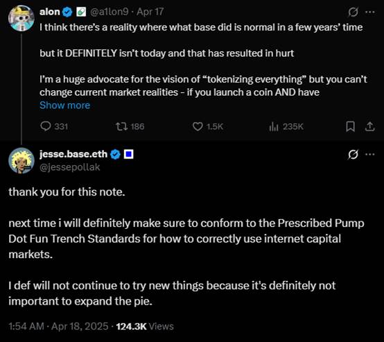 所以,回到这次 Jesse 要发行个人代币的事件,他所描绘的那些愿景对散户玩家们来说并不能够轻信。正如他当初回复 alon 的评论,这些东西是他「做大蛋糕的、对新事物的尝试」。一方面,他作为 Base 的老大这样的说法很合乎情理,而另一方面也能看出他对于发行代币的一种心态,即「既然是尝试,就有可能失败」。
