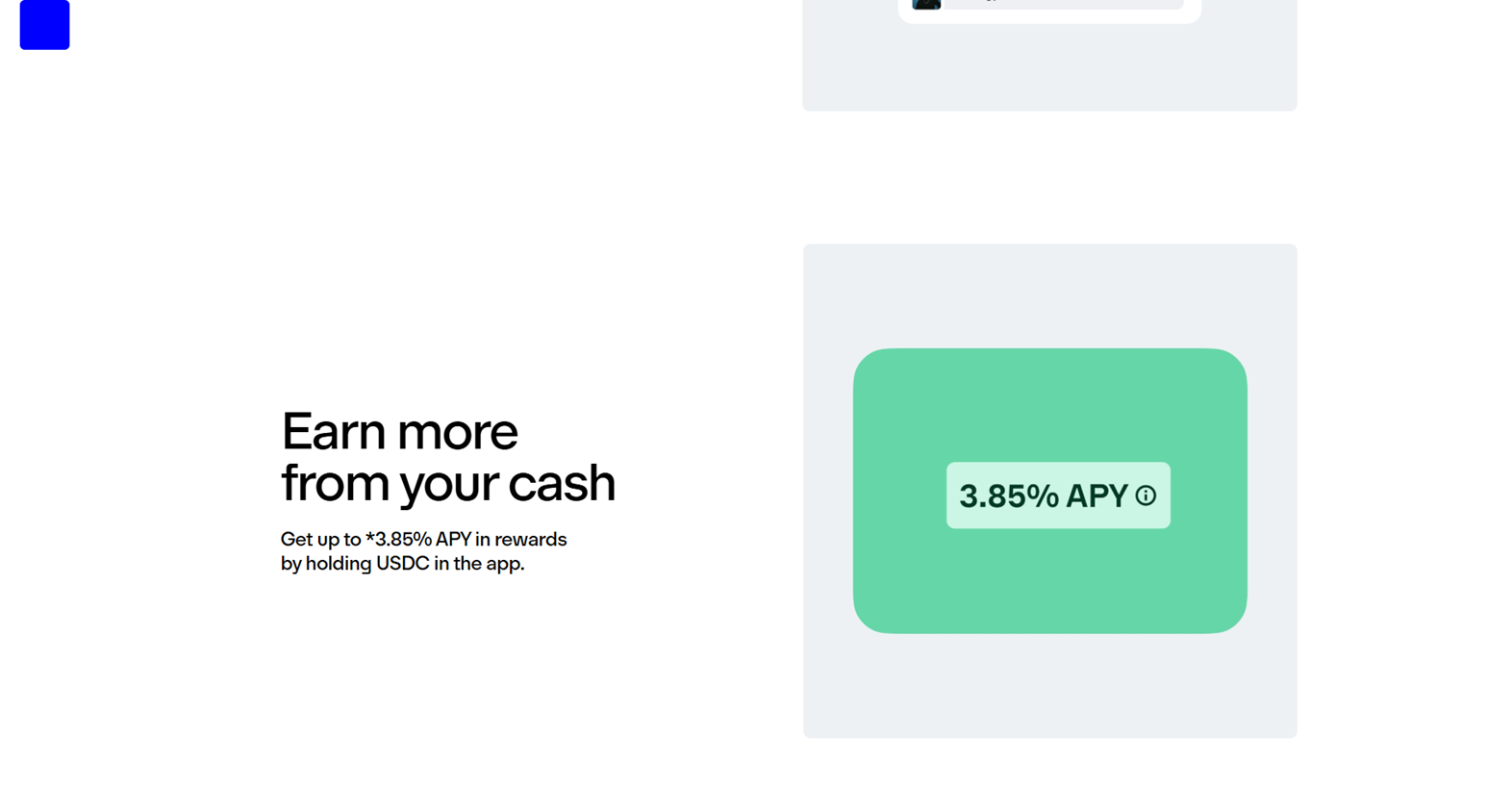 但实际上,这很像是亲自入局为 Base App 打广告。Base App 很像 Coinbase 自家的「支付宝」,它既是 Base 网络的应用枢纽,又涵盖了一个带有创作者经济机制的社交网络,还可以在其上进行代币的交易以及转账,甚至还有「余额宝」——在 Base App 中的 USDC 可以享受到高达 3.85% 的年化收益率。
