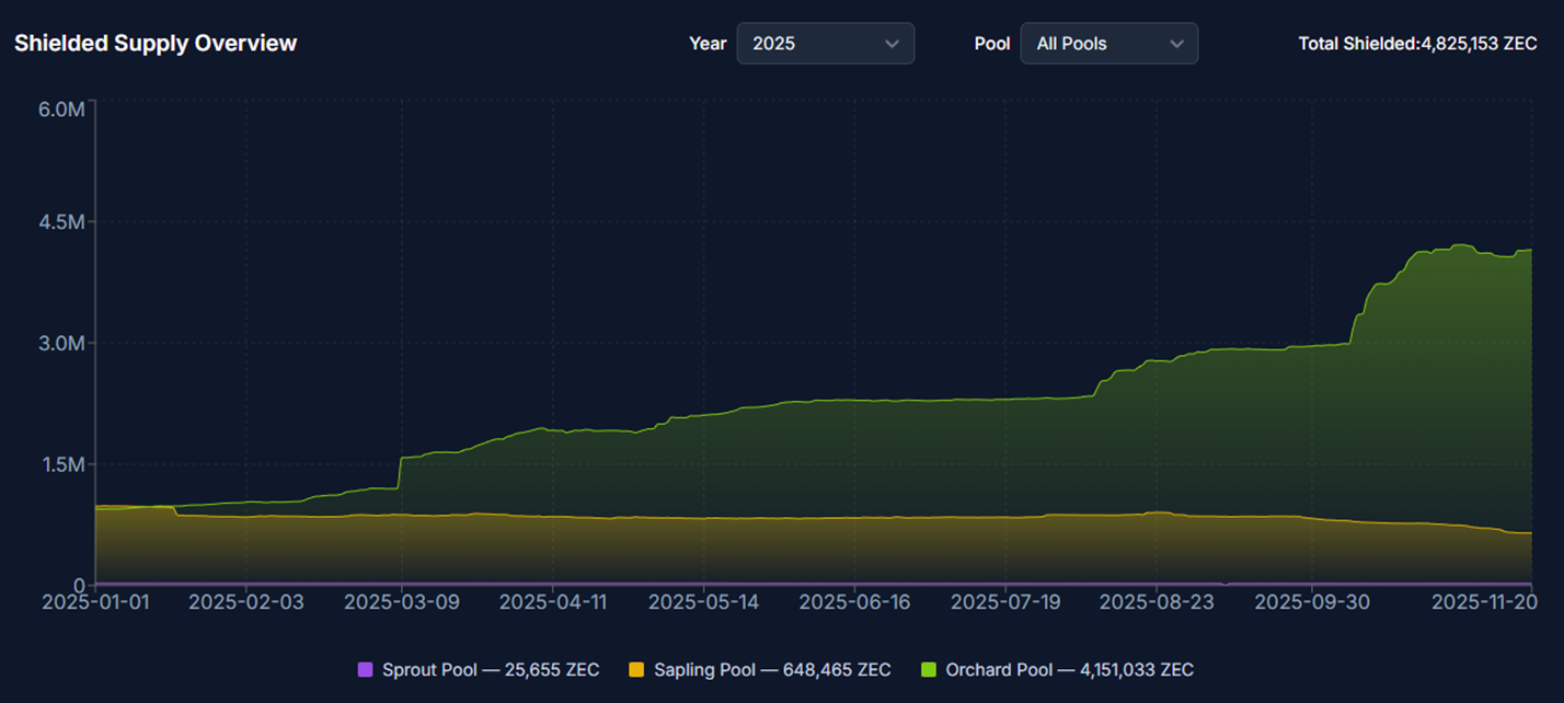 链上数据证实了真实需求的增长。ZEC 屏蔽池余额从今年年初的约不到 200 万枚增长至如今的约 480 万枚,增幅达 140%;屏蔽交易数量也随着网络整体活跃度的提升而有所提升,每周均大约能达到 10%。