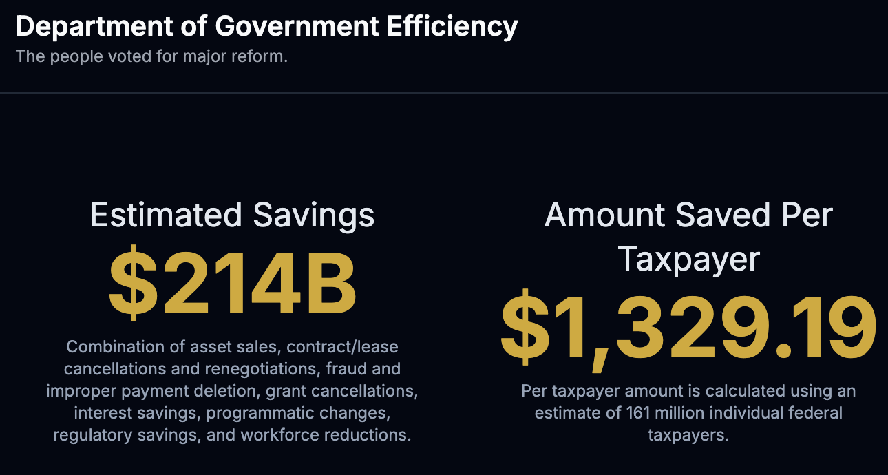 截至撰稿时间,DOGE 网站声称该部门通过「资产出售、合同/租赁取消与重新谈判、欺诈和不当付款删除、拨款取消、利息节省、项目变更、监管节省和裁员」共同获得了 2140 亿美元的节省,相当于每位纳税人 1329.19 美元。