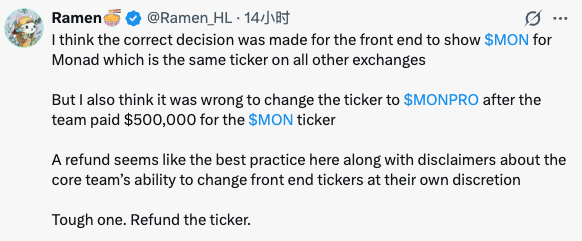 「前端最重要的因素是保护用户。用户买错代币对所有人都是坏事。据我所知,所有主要交易场所都在几周前将 MON 改显示为 MONPRO 了。拍卖是链上的 Gas 费,Mon Protocol 团队仍然拥有 MON 的 Ticker。任何其他前端都可以随心所欲地命名。」这番话翻译过来就是:为了防止用户混淆,我们牺牲了原 Ticker 主人的显示权。