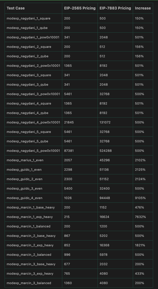 这些价格上涨的动机源于基准测试,该测试表明在许多情况下 ModExp 预编译的定价明显偏低。修订后的公式将小型操作的 Gas 费用提高 150%,典型操作提高约 200%,而大型或不平衡操作的 Gas 费用则提高更多倍,有时甚至超过 80 倍,具体取决于指数、底数或模数的大小。