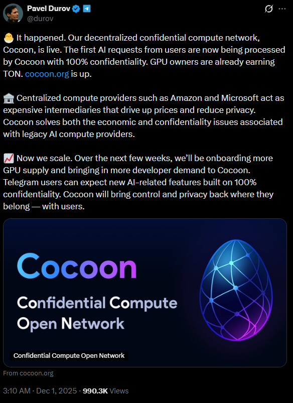 昨天,TELEGram 创始人 PaveL Durov 发推宣布,他们的去中心化隐私计算网络 Cocoon 正式上线。