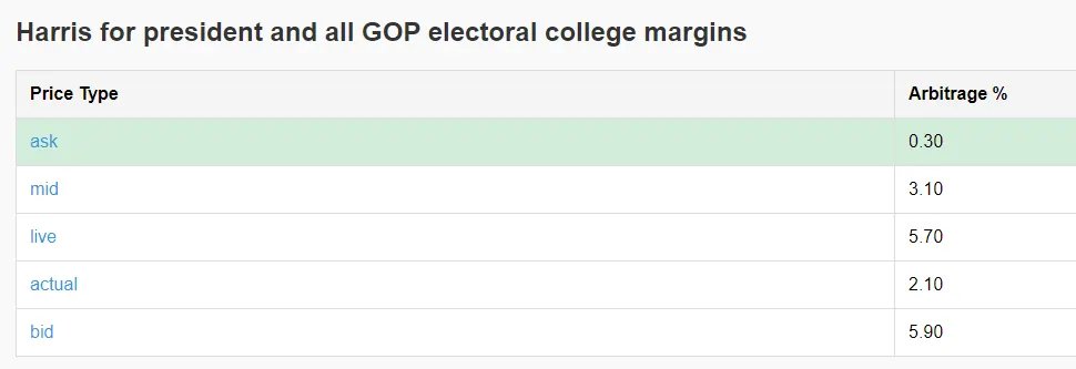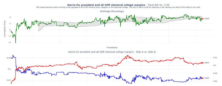 套利 1:买入「哈里斯当选总统」并同时买入所有「共和党赢得不同选举人票差距」的结果这个策略相当直接:一边押注卡玛拉·哈里斯赢得总统大选,一边买入共和党在选举人团中所有可能的胜选差距。实质上,这两类头寸彼此对冲。如果两边头寸的总价格低于 1,那么差值部分就是可以锁定的收益率——也就是套利空间。截至今天,这笔交易的套利幅度为 3.5%,距离大选还有 41 天。换算成年化,大约相当于 41% 的年化回报。
